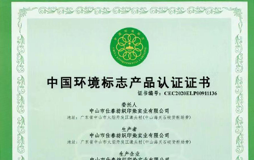 仕春紡織公司-中國環(huán)境標(biāo)志產(chǎn)品認(rèn)證證書1