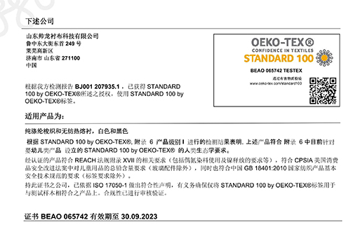 帥龍村布公司-Oeko-Tex 100生態(tài)紡織品認(rèn)證證書