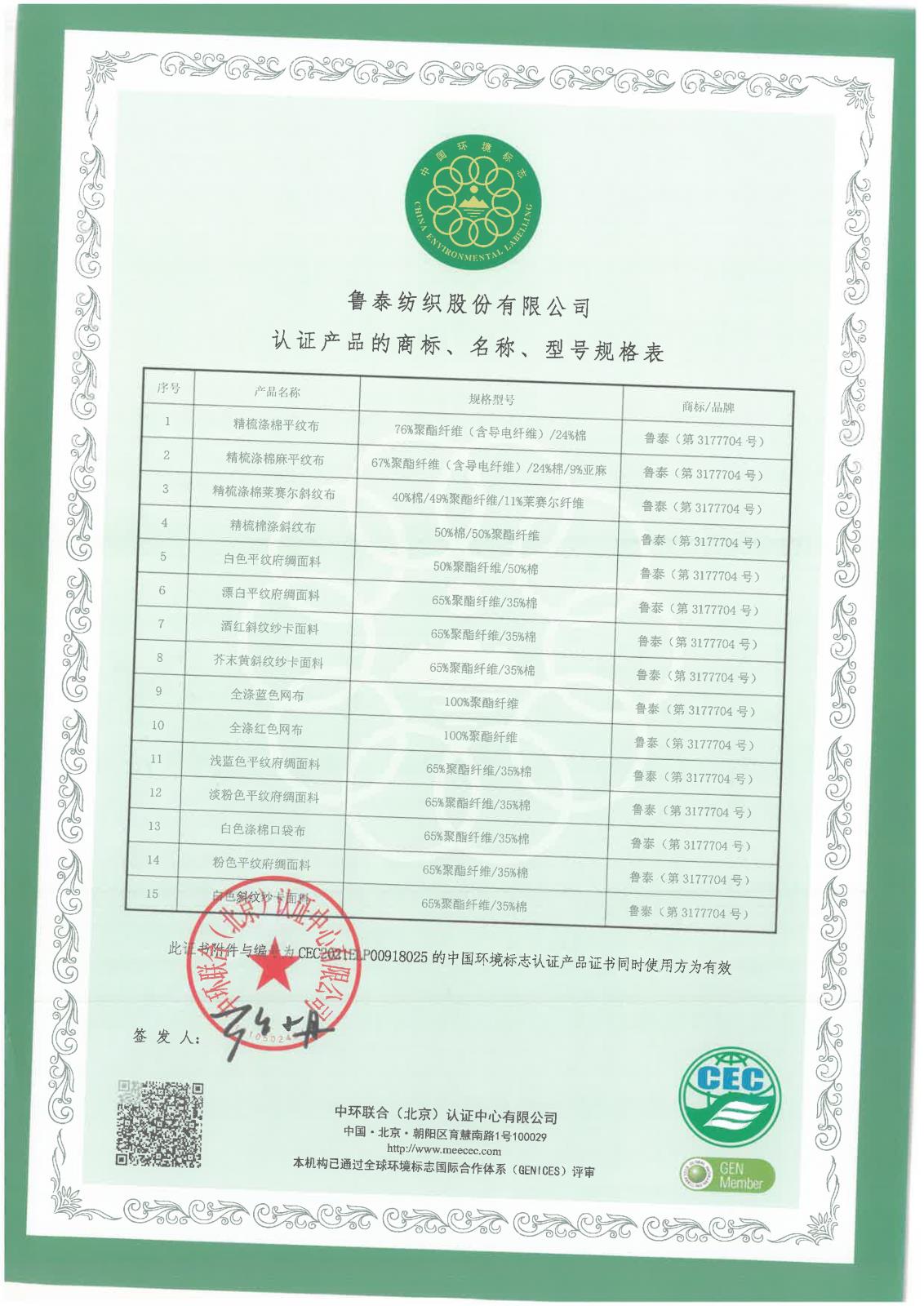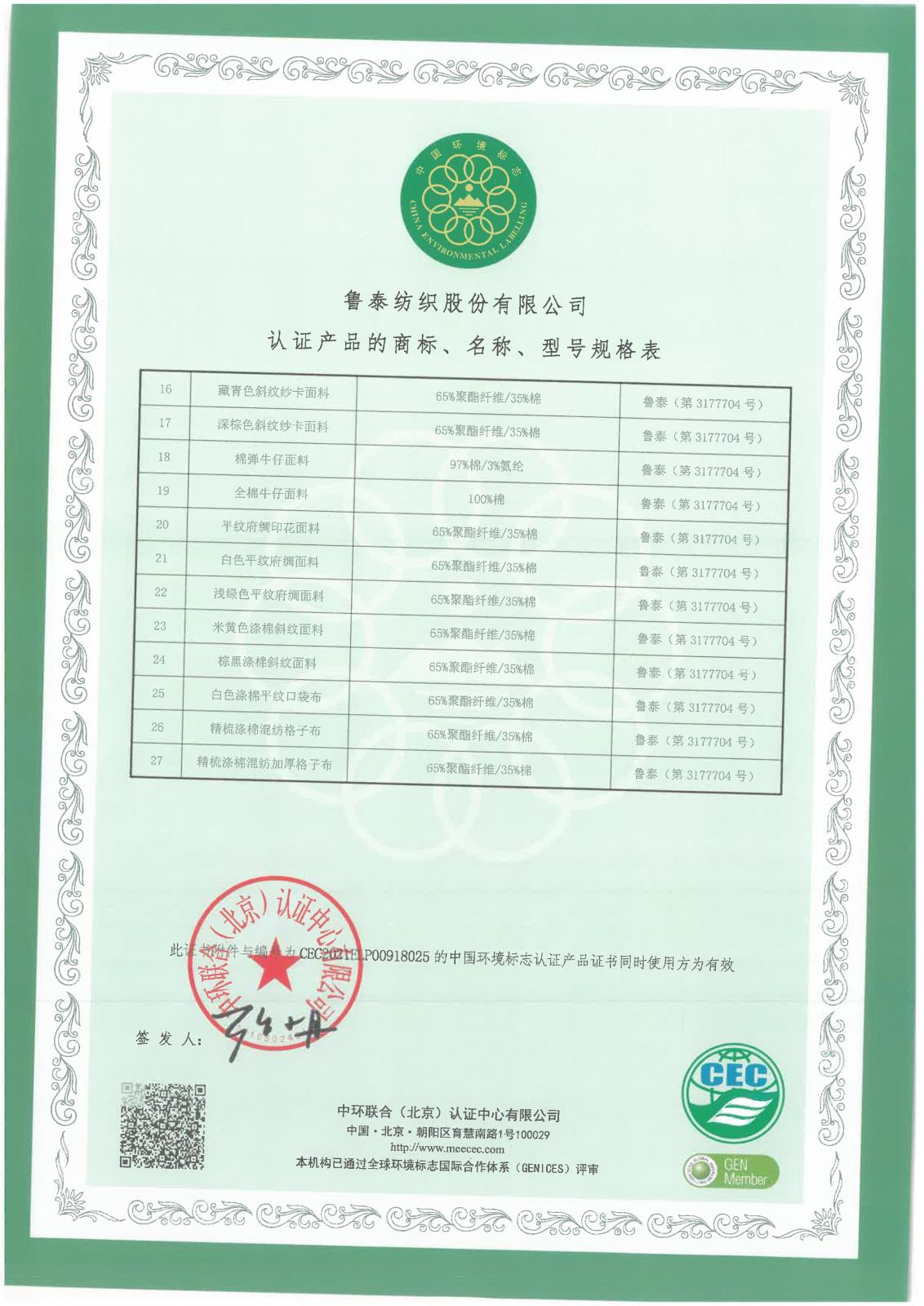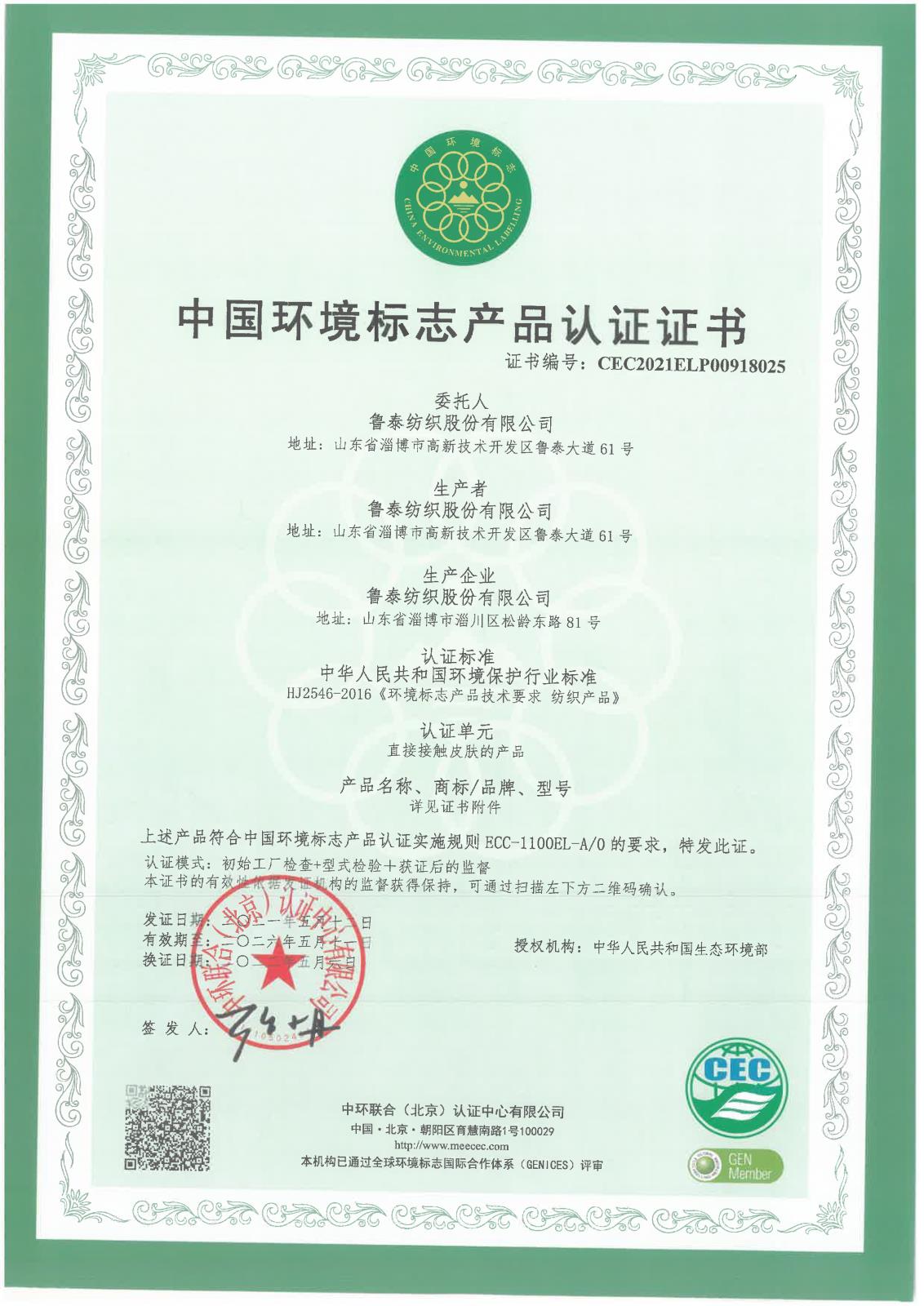 魯泰紡織公司-中國環(huán)境標(biāo)志產(chǎn)品認(rèn)證證書